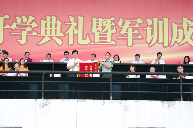 王冬宣读军训表彰决定。校领导为军训先进连排、军训先进个人、优秀带队教师、优秀军训教官颁发奖状。王仁雷代表我校向承担施训任务的部队赠送锦旗。