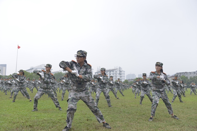 在军训团团旗的引导下,各连组成的方阵依次通过主席台,他们步伐整齐、口号嘹亮,气势如虹、豪情万丈,以最佳的精神面貌展示了本次军训的成果。在为期13天的军训中,他们刻苦训练、勇于争先,展现了我校学子昂扬的斗志和积极向上的精神风貌。接下来进行了军训成果汇报表演。2018级新生们进行了女子军体拳、女子匕首操、男子刺杀操表演。同学们动作有力、招招生威,展现出压倒一切的壮志豪情,赢得了全场热烈的掌声。