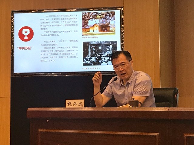 祝兴成围绕“长征与毛泽东思想的形成”,剖析了井冈山会师、五次反围剿、遵义会议等历史事件,带领大家重温英雄史诗,追忆峥嵘岁月,感受长征精神。