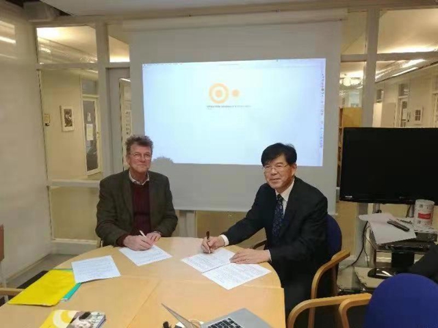 10月24日访问瑞典索德托恩大学。代表团与该校副校长 Gustav Amberg,副校长特别助理Michael Forsman,欧洲科学院院士、传媒艺术学院院长Göran Bolin,教师培训学院院长Anders J Persson等进行了会谈。双方介绍了各自学校近年来的建设情况和未来的发展规划,共同探讨了关于教师的教育与培训、传媒专业的学生互换与教师互访、在南京建立院士工作室(人工智能加教育方向)等内容。王仁雷与Gustav Amberg共同签署了在南京建立院士工作站的合作备忘录。