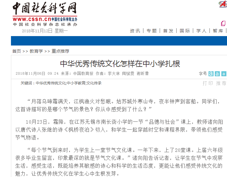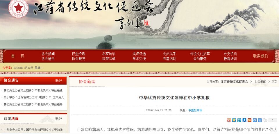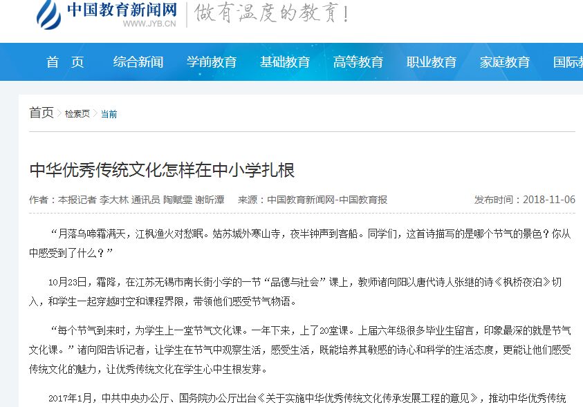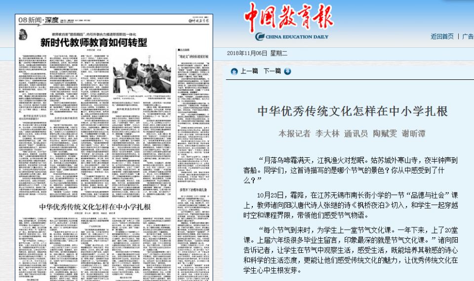 11月6日,中国教育报第八版报道了我校“传统文化国培计划示范项目”建设情况。人民网、光明网、中央人民广播网、中国社会科学网、中国教育新闻网、国际在线、江苏省传统文化促进会等多家国家级主流媒体转载了该报道。