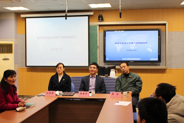 刘素梅作“教师专业成长背景下的师德培养”专题讲座。她概述了师德建设的内涵,指出教师专业化的核心内容包括教师的专业知识技能和教师的专业服务精神(即师德)两个方面,号召青年教师做“用爱心铸就师魂”的践行者。