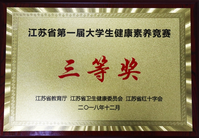 12月8日,由江苏省教育厅、江苏省卫生健康委员会、江苏省红十字会主办,东南大学、江苏省疾病预防控制中心、江苏省高等教育学会、高校卫生保健研究会承办的“江苏省第一届大学生健康素养竞赛决赛”在东南大学九龙湖校区成功举办。我校由学前教育学院的魏源、生化学院的郭迎春、经法学院的孔露组成的代表队在决赛中稳定发挥,最终获得了三等奖的好成绩。全省111所高校,8万余名大学生参加了网络初赛。通过片区比赛,最终24所高校进入省总决赛。