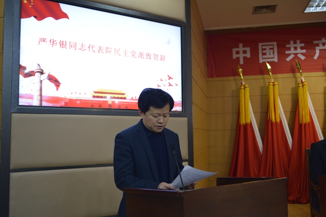 民主党派代表、院农工支部主委严华银致贺词。他代表院各民主党派和无党派,向大会的召开表示热烈的祝贺。他表示,院各民主党派和无党派一定一如既往,紧密团结在院党委周围,充分发挥自身的优势和特点,团结广大成员,为实现本次党代会所确立的我院事业发展宏伟目标而努力奋斗。