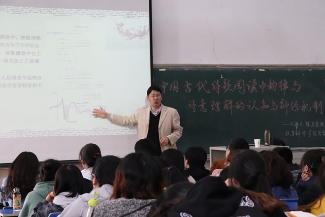 4月3日下午,教科院邀请南京师范大学心理学院副院长陈庆荣教授来院,为应用心理专业和小学教育专业的学生作了一场题为“中国古代诗歌阅读中韵律与诗意理解的认知与神经机制”的学术报告。