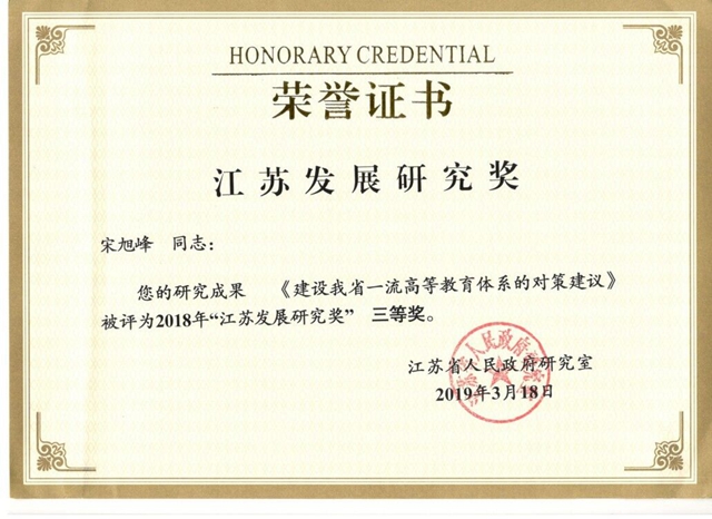 近日,江苏省人民政府研究室公布了“2018年江苏发展研究奖获奖名单”(苏政研〔2019〕6号),我院共有三项研究成果获奖。其中,由王淑芬副研究员撰写的决策咨询报告《江苏义务教育教师“县管校聘”管理体制改革的现状、问题与对策》获评优秀成果一等奖;由潘健教授、黄正平研究员、龚郑勇副教授撰写的决策咨询报告《江苏省免费男幼师培养政策实施状况、焦点分析及对策建议》获评优秀成果一等奖;由宋旭峰研究员撰写的决策咨询报告《建设我省一流高等教育体系的对策建议》获评优秀成果三等奖。