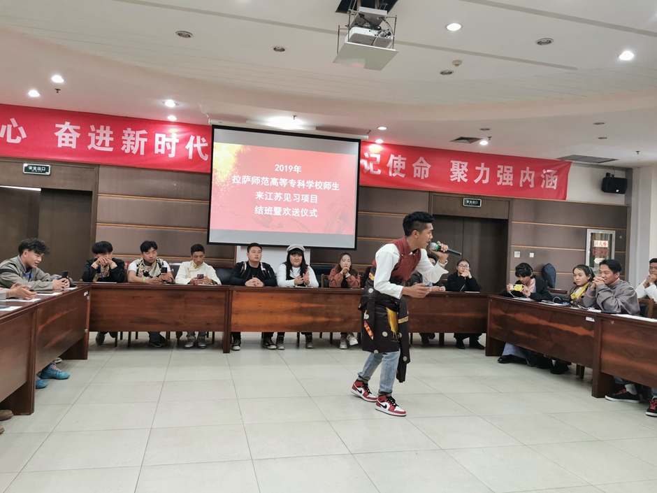 11月15日下午, 2019年拉萨师范高等专科学校师生来宁见习结班暨欢送仪式在草场门校区举行,教务处副处长万东升,教学实践科邓海威、王蕾,拉萨师专郝嫘儡、王芳、韩春霞老师以及学前教育等6个专业的38名见习学生参加仪式。邓海威主持仪式。