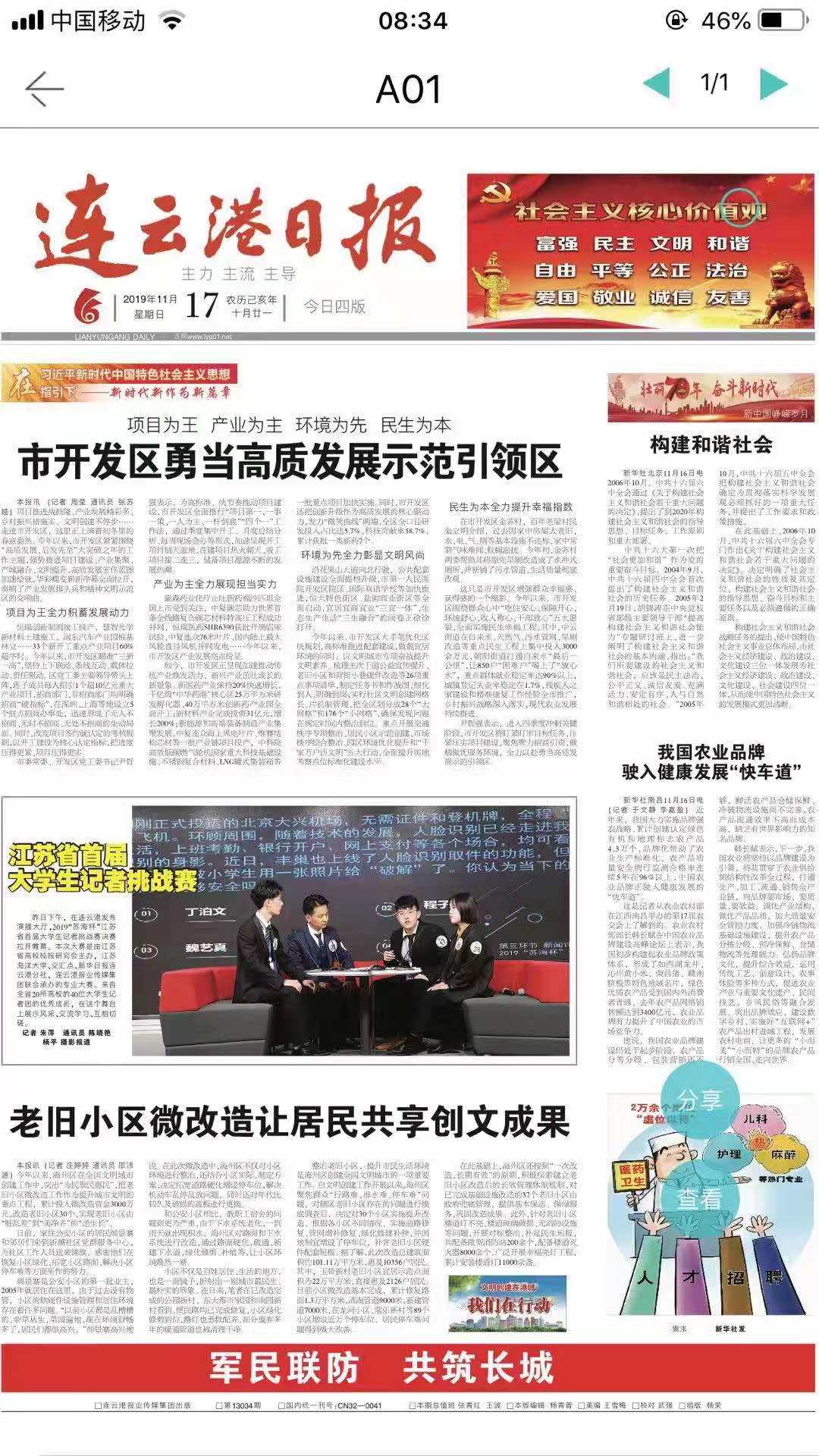 11月16日下午,2019“苏海杯”江苏省首届大学生记者挑战赛决赛在连云港圆满落幕,来自全省20所高校的40位大学生记者团的优秀成员,在舞台上展示风采、交流学习、互相切磋。我校学通社记者魏艺真、于萌萌代表学校参赛并荣获一等奖、优胜奖,交汇点、新华报业网、连云港日报、连云港发布等多家媒体对赛事和我校学生进行报道。