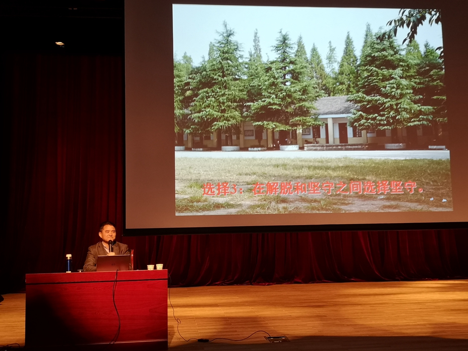 杨瑞清讲述他从教历程中学陶师陶的四十年经历面临的四个选择:是进城还是回乡?是从政还是从教?是解脱还是坚守?是守成还是转型?四个选择分别穿插了行知集团从实验班到如今规模的四个阶段。他还用“盼头”作为成长的关键词,盼头即看到希望、发现意义、创造价值,并许下了“立足做良师,力争做名师”的美好期愿。他用荷花大王丁跃生种莲的例子勉励同学们“终身学习,学以致用”。他鼓励同学们要读好行知这本大书,读好实践这本活书,读好生命这本天书;他勉励同学们躬于实践、勤于读书、善于交友、乐于动笔,要学会赏识,对待学生尊重人格、相信潜能、理解个性、激励优点、包容特点、提醒缺点;要学会坚持:对于自己的选择要坚持。