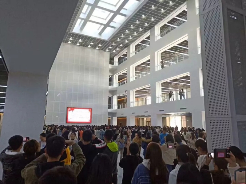 上午,宽敞的前坪广场上排起了长长的队伍,近千名师生排队进馆参加开馆活动。上午9:30起,“进馆有礼,只为遇见你”活动开始,首批入馆的师生读者纷纷提笔在开馆留言板上写下自己对新图书馆的感想、祝福和期待,并领取图书馆赠送的开馆小礼物。短短一个小时留言墙上就贴满了数百条留言。