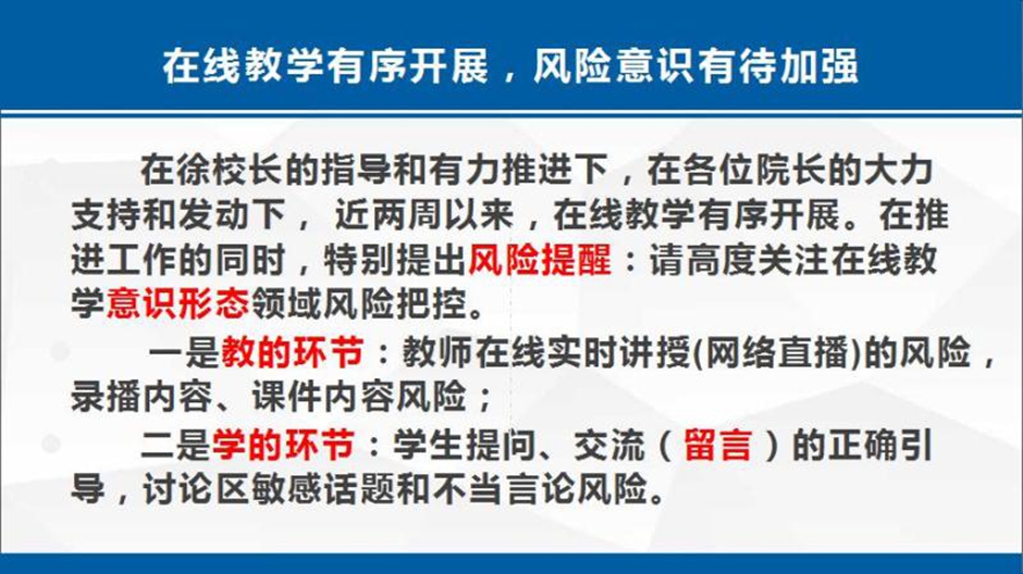 教务处处长徐新萍对各部门前期线上教学组织与实施工作给予了肯定。她指出,线上教学稳步推进近两周以来,教学秩序良好,但应继续加强教学管理,积极开展线上教学研究,强化线上教学督导,保证线上教学与线下教学同质等效。她强调线上教学需切实提高风险意识,高度关注在线教学意识形态领域风险把控。她要求广大教职员工要注意舆论导向,不造谣、不传谣、不信谣,大家共同努力,确保我校在线教学环境优质健康、在线教学工作平稳安全高质量地开展。