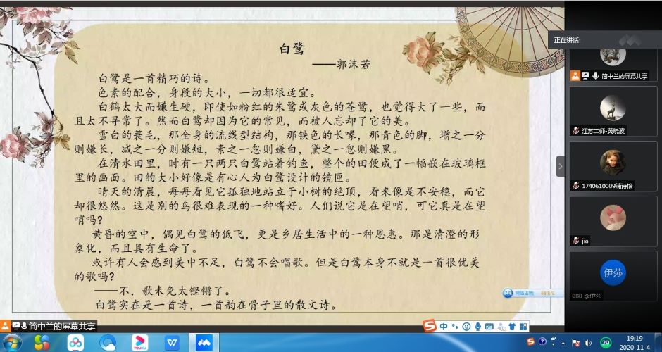 简老师为同学们详细介绍了教师编制考试面试流程和注意事项,并以《白鹭》《荷叶圆圆》《爬天都峰》等三个试讲课例,就教学环节设计、语用教学安排、写字教学指导、师生互动等教学设计方面为同学们作了试讲分析。简老师还结合近期指导青年教师备课赛课的经历,讲解了《西门豹治邺》的同课异构的教学设计。