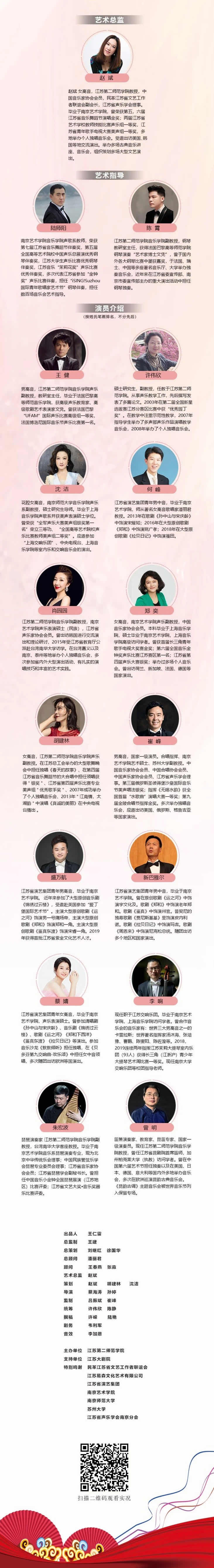 此次云端音乐会分为《乐起如水》、《河润故土》、《情咏家国》三个篇章,共有《运河之歌》、《多情的土地》、《祖国慈祥的母亲》等19首曲目,此外,增设访谈环节,歌唱家们将带领音乐爱好者全面感受艺术歌曲的魅力。据音乐会相关负责人介绍,江苏第二师范学院非常重视运河文化的挖掘,打造了京杭大运河江苏流域戏剧文化传承创新项目,接下来他们将在传承创新领域继续开拓研究,用更加多元的艺术形式,做好有关“大运河文化”的系列音乐活动。