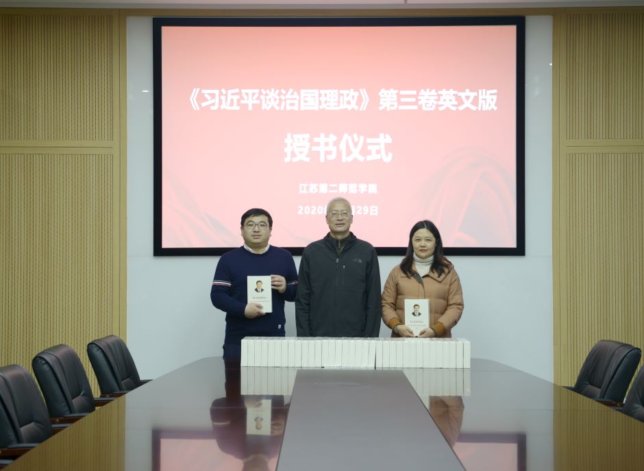12月29日,我校在石湫校区举行《习近平谈治国理政》第三卷英文版授书仪式。党委书记王仁雷、党委副书记潘文、总会计师姚振标出席仪式。党委宣传部部长卜玉平等,外国语学院党总支书记、院长张莉,党总支副书记余鑫,部分学生代表参加仪式。