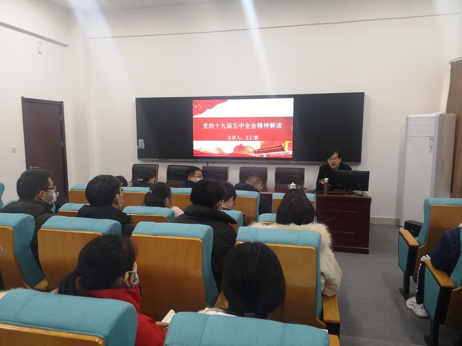 1月12日下午,党委书记王仁雷教授在石湫校区明理楼1-502报告厅给生化学院师生代表上了一堂题为“党的十九届五中全会精神解读”的形势与政策课,激励广大青年学生肩负时代责任,铸就理想信念、厚植爱国情怀、锻造过硬本领、锤炼品德修为、勇于砥砺奋斗,成为担当民族复兴大任的时代新人。