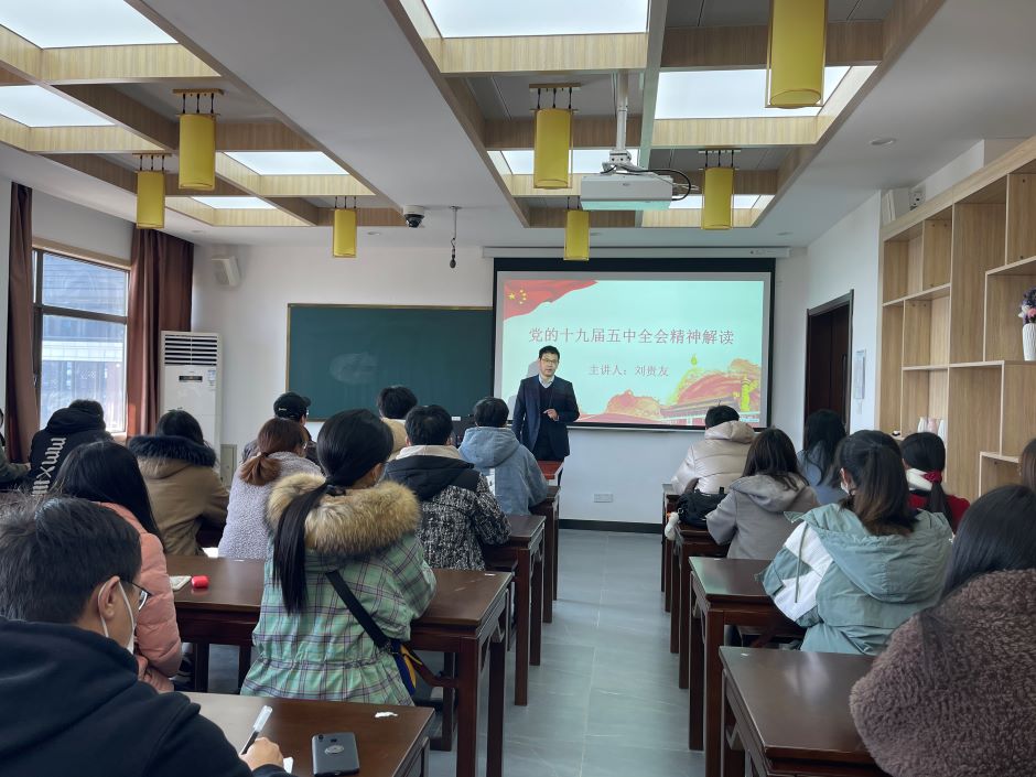 刘贵友从科学把握新发展阶段、深入贯彻新发展理念、加快构建新发展格局、坚持党的全面领导四个方面,对党的十九届五中全会精神进行了解读。他指出,十九届五中全会是我们党在重要历史时刻召开的一次十分重要的会议,全会审议通过的十四五“规划和2035年远景目标建议具有全局性、历史性意义。他还结合自身的学习、工作经历,用图片展示、数据对比等多样形式,讲解了《中共中央关于制定国民经济和社会发展第十四个五年规划和二〇三五年远景目标的建议》。