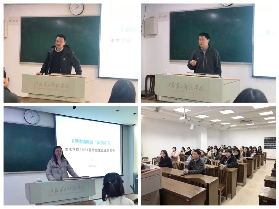 为更好地帮助2021届毕业生打响后疫情就业“保卫战”,日前,美术学院在草场门校区现教楼203教室分别针对美术学师范专业与视觉传达设计专业举行了3场2021届毕业生就业动员大会。招就处副处长黄晓波,美术学院党总支书记丁莹、副书记孙仕荣出席会议,就业专员章砚文主持会议。