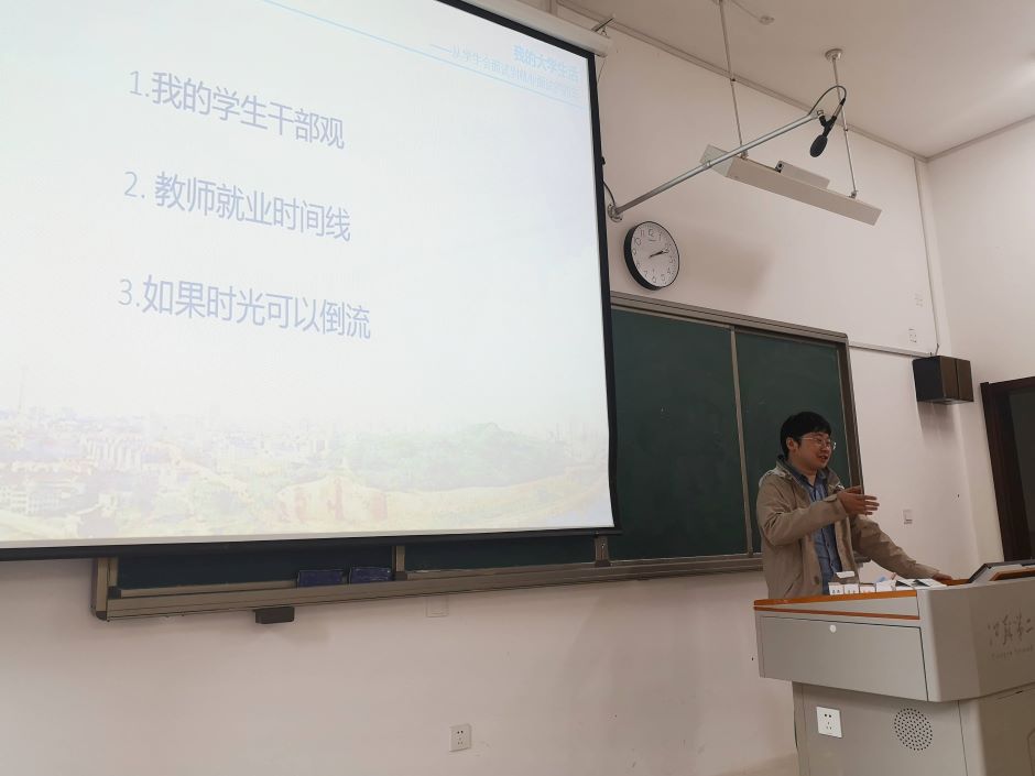 呙睿是我校2012届数学与应用数学专业毕业生、原校学生会主席,团十八大代表和全国优秀共青团干部、江苏团省委青年教师团讲师,是我校在学校共青团工作战线的优秀毕业生代表。他从一线教师的角度,围绕“我的学生干部观”“教师就业时间线”“假如大学时光可以倒流”三个话题,向大家作了大学经历分享。他回顾了在校学生会三年的经历以及当时为工作积累的各方面能力、经验和得失,讲述了在实习期间为实习指导老师批改作业的经历,鼓励同学们要多做小事,在小事中收获更多书本以外的知识;他介绍了教师编制考试的流程,并教大家作大学每一个阶段的规划;他勉励同学们要加强对教师职业的理解,要加强对职业应用的思考。最后,他以参加团十八大聆听的习近平总书记关于青年工作的论述,鼓励同学们投身教师行业,与新时代同向同行、共同前进。