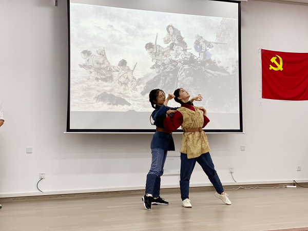 本次主题党日活动以文艺汇演的形式开展,活动在红色舞台剧《红船初心》的朗诵声中拉开帷幕。十二个节目以“经典、党史、青春”为纽带,通过朗诵、合唱、配音、趣味问答等形式重温红色经典,唱响红色旋律。电影《紫日》的片段配音、朗诵表演《八女投江》、合唱《我和我的祖国》《灯火里的中国》、群舞《黄河》等精彩节目,极富艺术感染力,通过一段段可歌可泣的事件,再现革命战争年代烽火岁月里中华儿女的伟大精神与爱国热情,抒发爱党爱国之情。