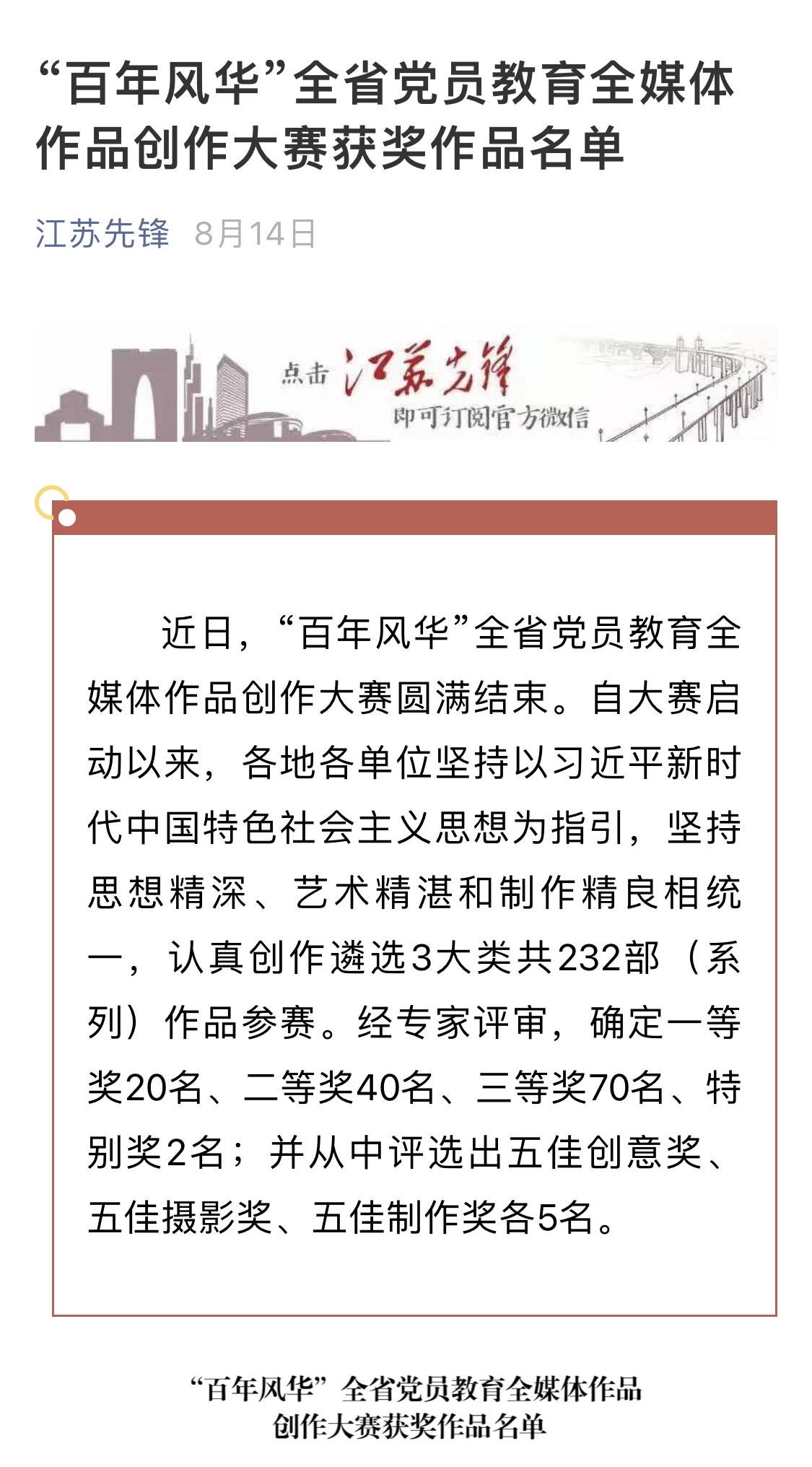 [江苏先锋微信平台]“百年风华”全省党员教育全媒体作品创作大赛获奖作品名单