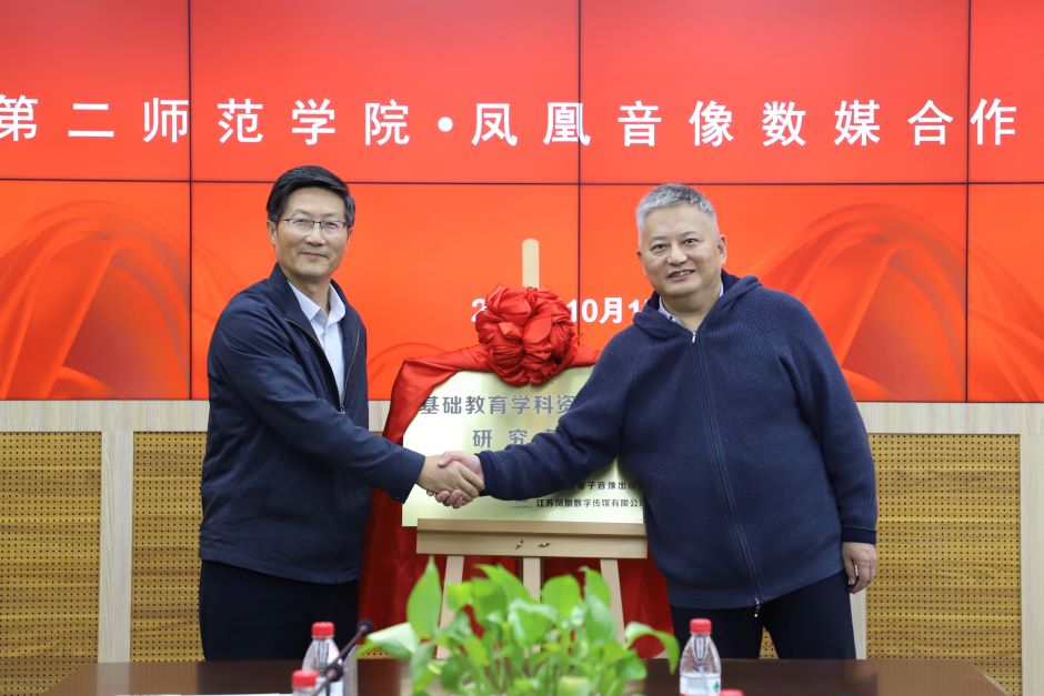 10月15日下午,我校在石湫校区与凤凰传媒集团举行合作揭牌仪式。校长王建,凤凰出版传媒股份有限公司党委书记、总经理佘江涛为“基础教育学科资源建设研究基地”揭牌。凤凰传媒副总经理宋吉述、凤凰音像数媒社长徐晨岷以及我校宣传部部长卜玉平、教务处处长徐新萍、科研处副处长王曦、教发中心主任顾晔峰等参加揭牌仪式,仪式由副校长刘贵友主持。