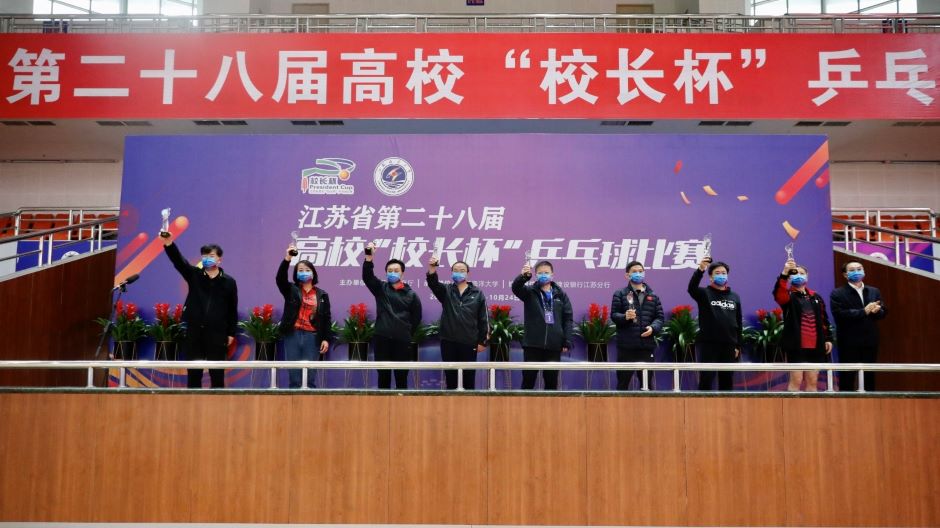 10月23、24日,第28届江苏省高校“校长杯”乒乓球比赛在连云港举行,我校由党委书记王仁雷、党委副书记潘文、副校长祝兴成、总会计师姚振标、纪委书记陈金如组成的代表队奋力拼搏,赛出了水平,赛出了风格,最终获得甲组(本科)第8名的历史最佳成绩。本届比赛共有113所高校组队参加。