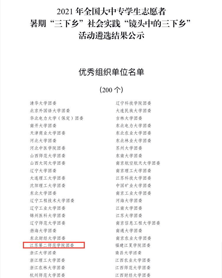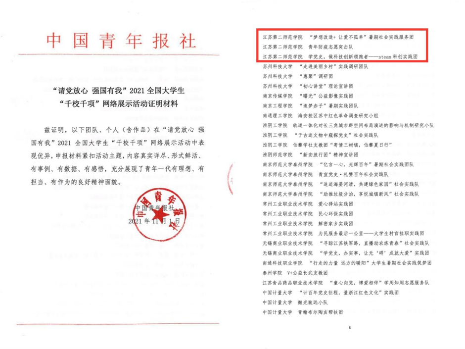 2021年6月,中宣部、中央文明办、教育部、共青团中央、全国学联等部门组织开展2021年全国大中专学生志愿者暑期文化、科技、卫生“三下乡”社会实践活动。我校积极响应号召,精心组织谋划,创新立项模式,以“重走奋斗百年路 青春启航新征程”为主题,广泛开展社会实践,取得了良好效果。近日,团中央青年发展部发布2021年全国大中专学生志愿者暑期“三下乡”社会实践活动总结通报结果,我校“梦想改造+让爱不孤单”暑期社会实践服务团获评全国“三下乡”社会实践优秀团队。在共青团中央主办的“请党放心,强国有我”2021全国大学生“千校千项”网络展示活动遴选中,我校“梦想改造+让爱不孤单”暑期社会实践服务团、青年防疫志愿突击队、steam科创实践团从上万支团队中脱颖而出,获得团队风采奖。由团中央青年发展部举办的2021年全国大中专学生志愿者暑期“三下乡”社会实践“镜头中的三下乡”成果遴选活动中,我校团委获优秀组织单位称号。
