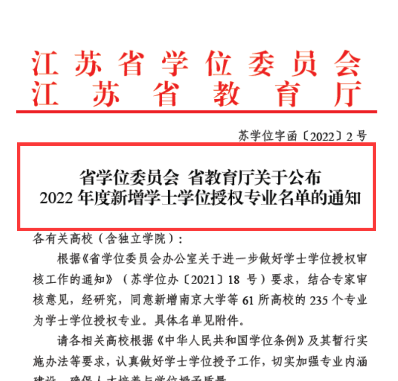 根据《省学位委员会省教育厅关于公布2022年度新增学士学位授权专业名单的通知》(苏学位字函〔2022〕2号)文件,我校俄语、财务管理、计算机科学与技术、环境设计和体育教育共五个专业通过学士学位授权专业审核,获得学士学位授权。