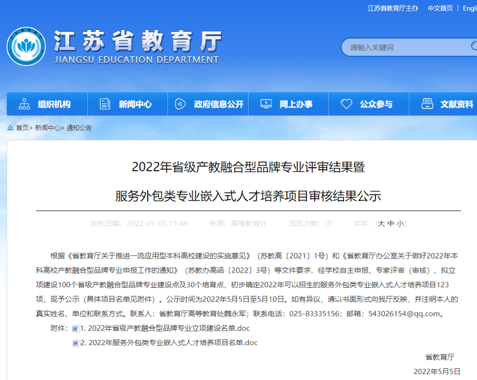 江苏省教育厅5月5日发布《2022年省级产教融合型品牌专业评审结果暨服务外包类专业嵌入式人才培养项目审核结果公示》,我校商学院“贸易经济”专业获批2022年省级产教融合型品牌专业培育点。