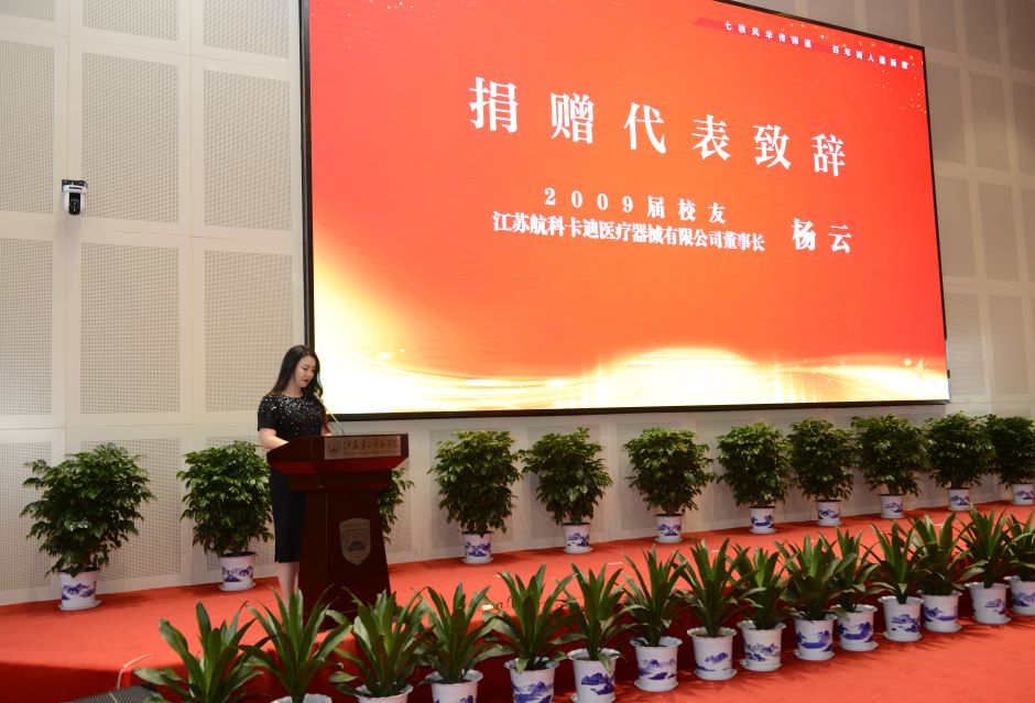 嘉宾和校友为母校捐款,并捐赠了书画作品、“校训石”等,献礼母校70周年校庆。江苏省国画院名誉院长、中国国家画院研究员、全国著名书画家、我校客座教授赵绪成先生为我校题写了校训“崇德敬业、求真创新”,作品雄健清雅、浑强宽拙,表达了对校训思想的深刻理解,展现了我校深厚的文化底蕴。中国美术家协会会员、江苏省美术家协会理事,我校美术学院原院长张广才教授专门为学校七十华诞创作了国画《源远流长》。画中郁郁葱葱的松树象征了学校始终践行立德树人的根本使命,漫天霞光和一轮红日象征学校灿烂辉煌的未来。党委书记王仁雷、总会计师姚振标、纪委书记陈金如代表学校接受捐赠。校友代表,北京航天卡迪技术开发研究所、江苏航科卡迪医疗器械有限公司董事长,我校音乐学院2009届毕业生杨云发言,诉说了对母校的拳拳赤子之情。