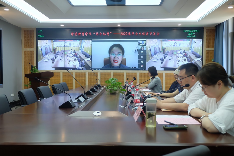 为促进毕业生充分、高质量就业,持续拓展校地、校企合作工作成效,学前教育学院积极搭建线上线下相结合的拓岗平台,推出“云双选”“云宣讲”服务。6月6日下午,学前教育学院在石湫校区举行“访企拓岗”2022届毕业生供需交流会。南京市浦口区教育局、南通市海门市直机关幼儿园、南京鹤鸣幼儿园,江苏抚育安托育机构等四所用人单位应邀开展线上宣讲,副校长徐国华出席会议并致辞,学前教育学院领导班子以及毕业年级百余名学生参加本次交流会。会议由学院党总支副书记王晶主持。