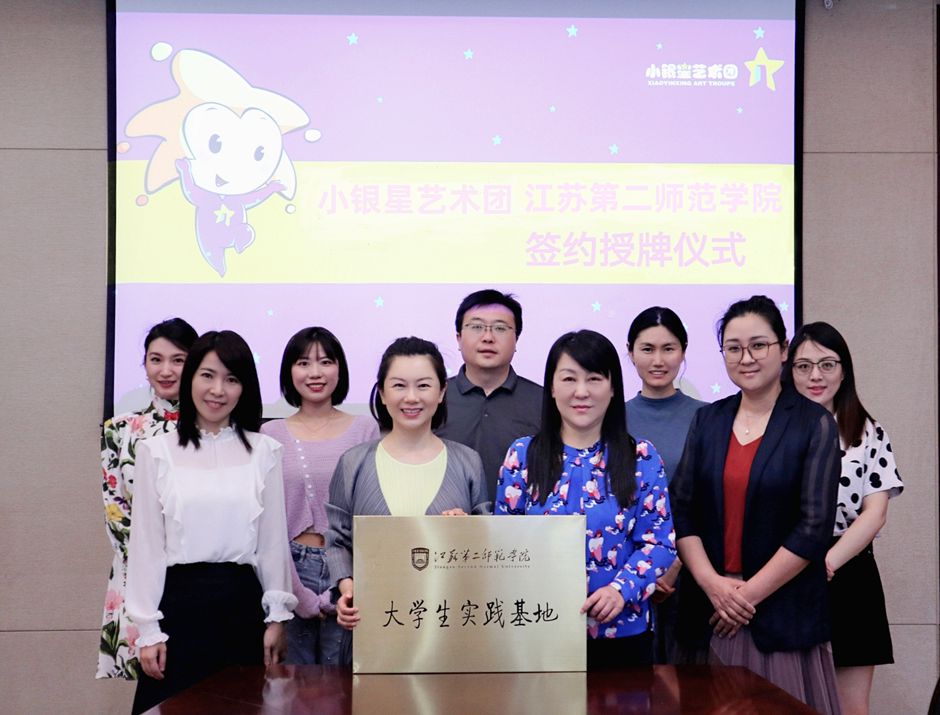 司南与南京小银星艺术团签署《关于共建江苏第二师范学院实习实训基地协议书》,刘继红为南京小银星艺术团授牌。