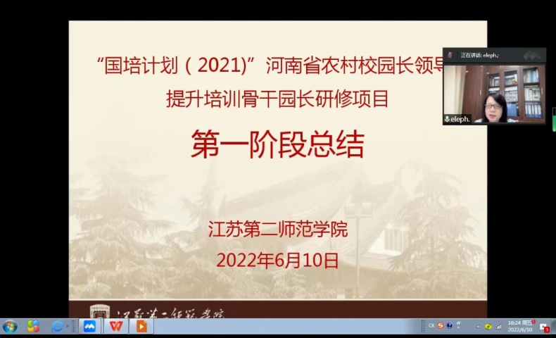 6月10日下午,按照“研训回顾、学员总结、专家点评、班主任小结、表彰优秀学员、领导讲话”的议程进行集中研训第一阶段总结。会上7名学员作了深度研修总结反思交流,学前教育学院副教授徐琳进行了点评。徐群对本次培训的亮点和特色进行了总结,对下阶段的网络异步培训作了安排。