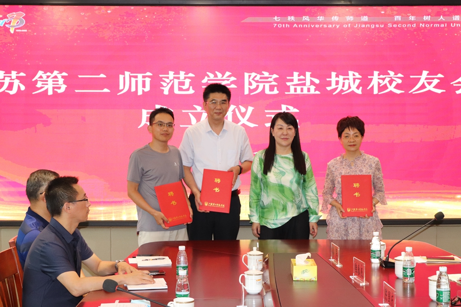 刘继红为盐城校友会负责人授牌、颁发聘书,并与参会嘉宾及校友代表合影留念。