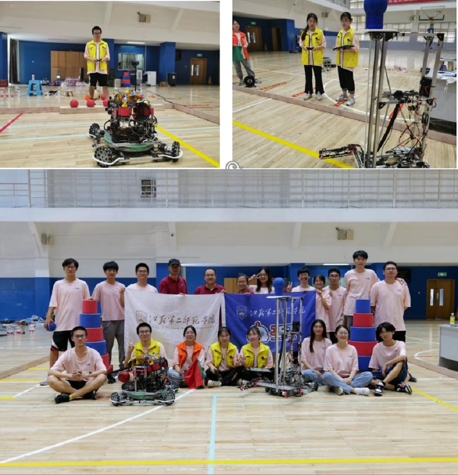 理想成绩源于充分备战:今年的赛事因疫情影响一再延迟,最终确定为线上比赛,通过网络视频的形式进行直播,组委会根据规定动作完成的情况进行评分。我校机器人团队自六月底转至草场门校区体育馆备赛,期间得到了校党委、校团委、教务处、体育学院、教师发展中心的大力支持。物理与信息工程学院诸明倩老师担任领队,与队员们齐心协力,克服了场馆高温、设备故障、物流迟滞、场地搭建等重重困难,让两台机器人以近乎完美姿态展现在国赛舞台上。
