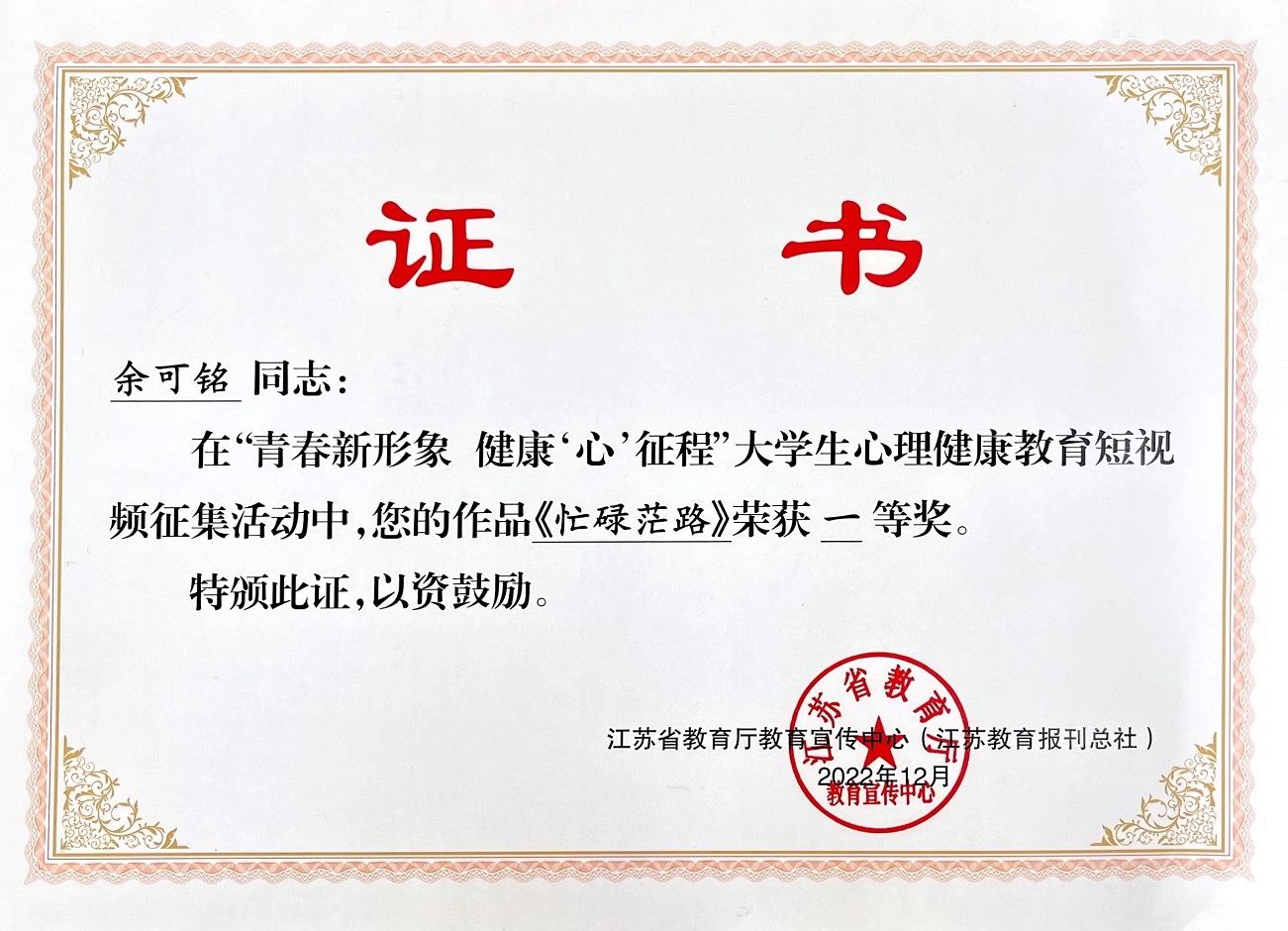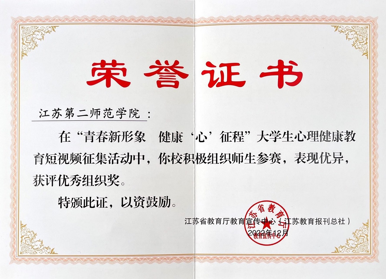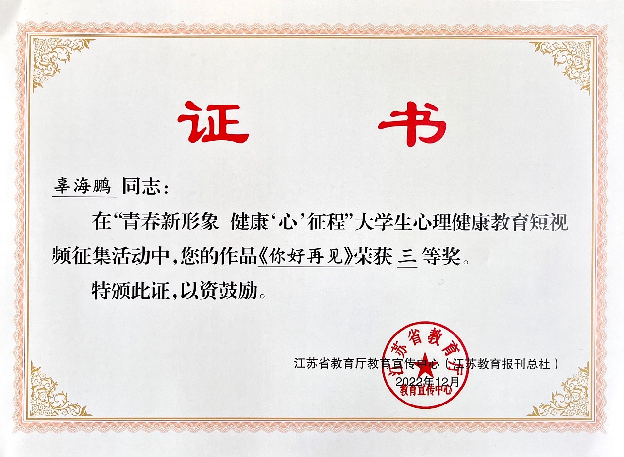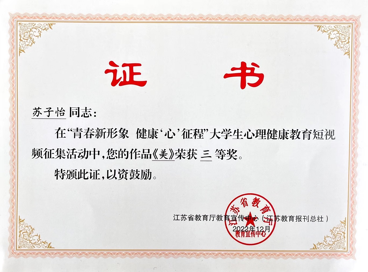 近日,江苏省教育厅教育宣传中心公布了2022年“青春新形象 健康‘心’征程”大学生心理健康教育短视频征集活动获奖名单。我校荣获优秀组织奖,选送3个参赛作品分获一等奖1个、三等奖2个。