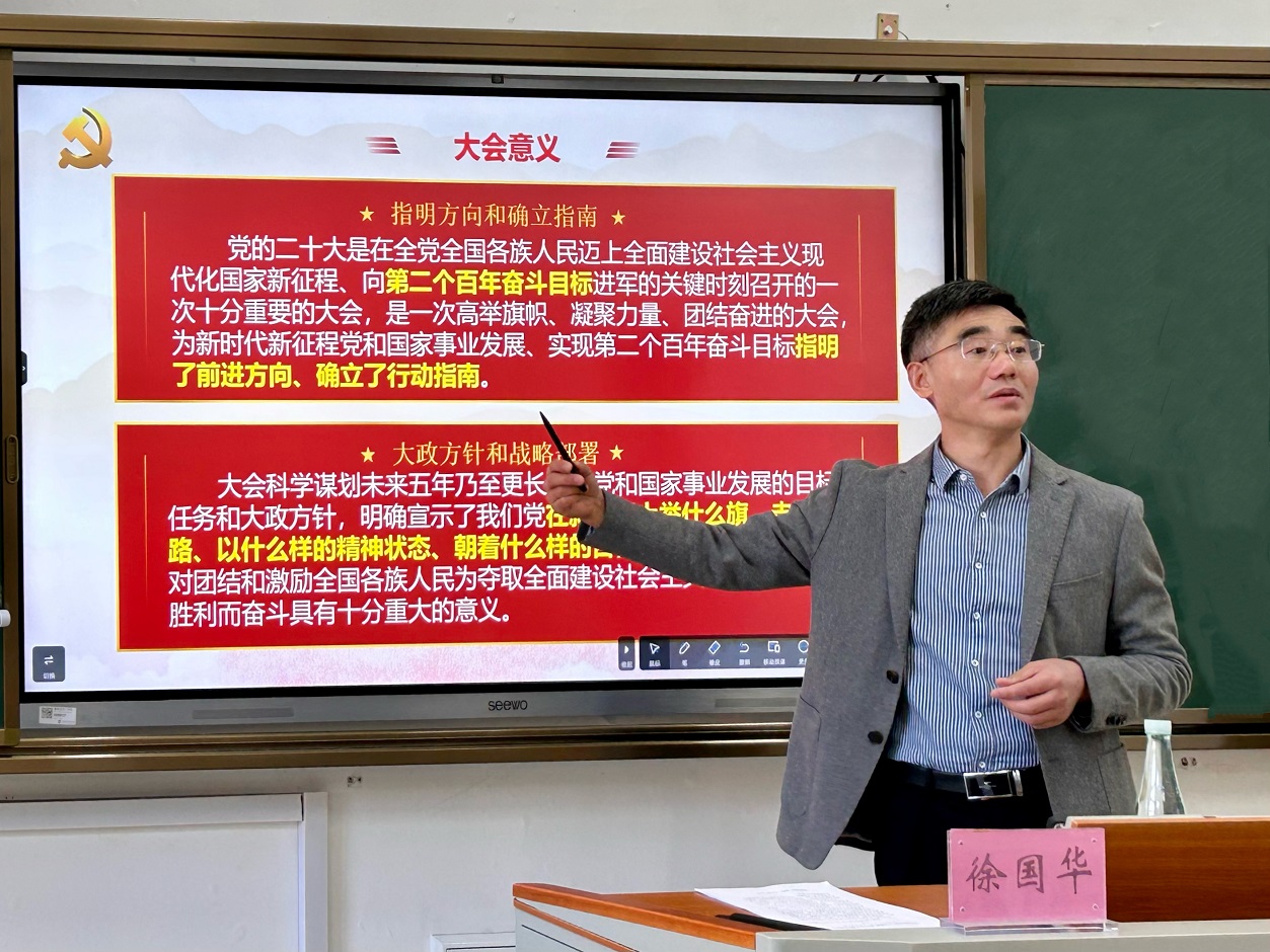 首先,徐校长向同学们描述了党的二十大主要概况。二十大是在全党全国各族人民迈上全面建设社会主义现代化国家新征程、向第二个百年奋斗目标进军的关键时刻召开的一次十分重要的大会。徐校长从旗帜、思想、精神、路径、目标五方面全面解析了大会的主题,我们应高举中国特色社会主义伟大旗帜,全面贯彻习近平新时代中国特色社会主义思想,弘扬伟大建党精神,自信自强,守正创新,踔厉奋发,勇毅前行,为全面建设社会主义现代化国家、全面推进中华民族伟大复兴而团结奋斗。接着,徐校长以习近平总书记参与广西代表团的讨论时提出的“五个牢牢把握”作为导引,向同学们介绍了大会的流程和规范,强调了党的二十大报告的重要意义。党的二十大是全国人民的一次盛会,我们应着重宣传、学习、贯彻党的二十大精神。