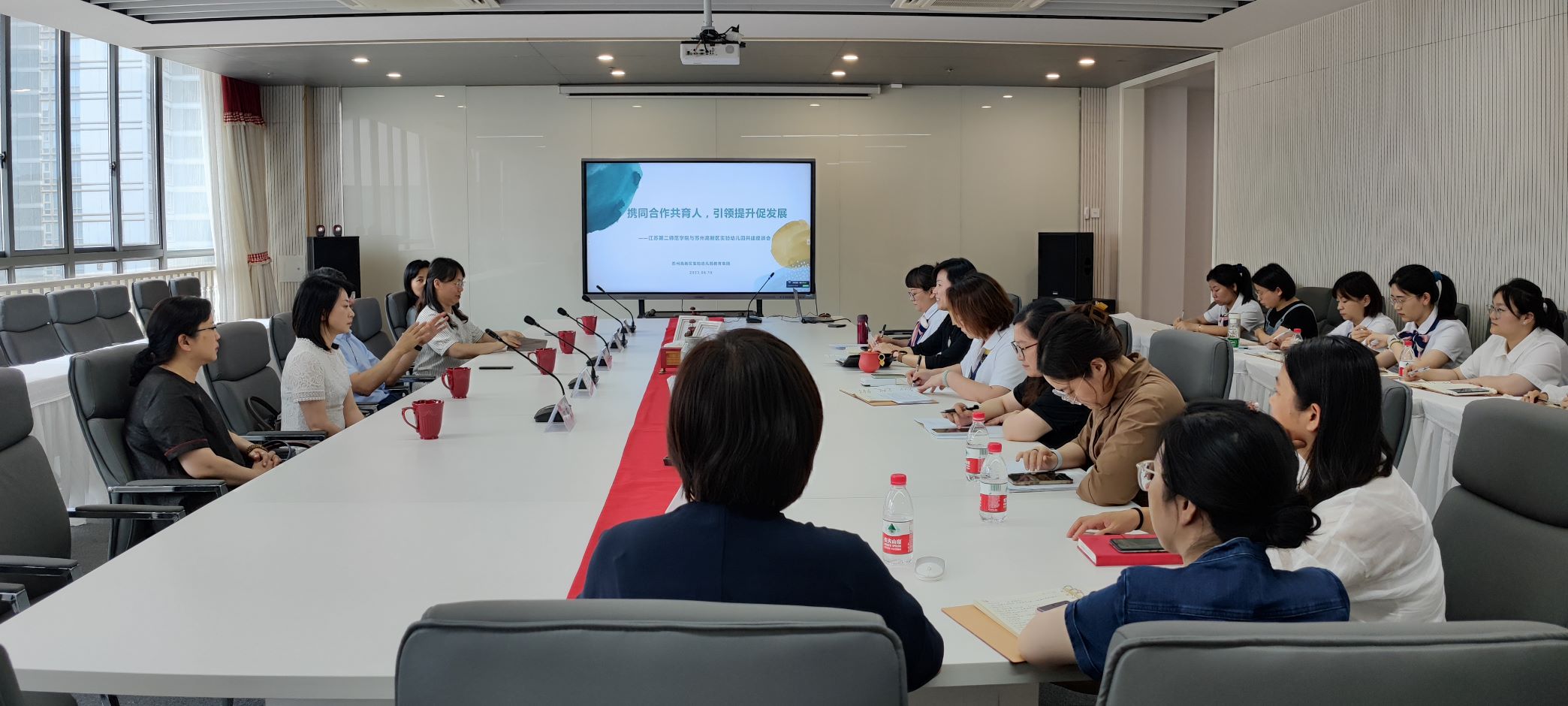 6月15日,在徐国华校长带领下,江苏第二师范学院学前教育学院院长田燕、音乐学院院长王春燕、学前教育学院党总支副书记王艳以及副院长郭莉,前往苏州高新区进行访企拓岗活动。苏州高新区教育工委书记、教育局局长周剑,苏州高新区教育工委委员、苏州高新区教育发展中心主任张俊辉,苏州高新区实验小学校教育集团党委书记李志清接待来访。一行人参观了苏州高新区实验小学,并应邀出席苏州高新区“教师专业发展半月谈”培训活动,徐校长的致辞拉开了活动序幕。徐校长在讲话中结合国家政策分析了教师发展的思路、要求与路径,肯定与勉励苏州教师队伍建设的实践创新。