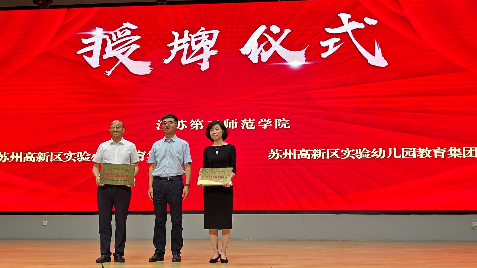 活动中,徐校长为苏州高新区实验小学教育集团、苏州高新区实验幼儿园教育集团授牌“江苏第二师范学院高新区教师专业发展实验基地校”。这标志着江苏二师与苏州高新区校(园)共同开启教师培养培训的深化合作,探索教育教学改革的新路径。