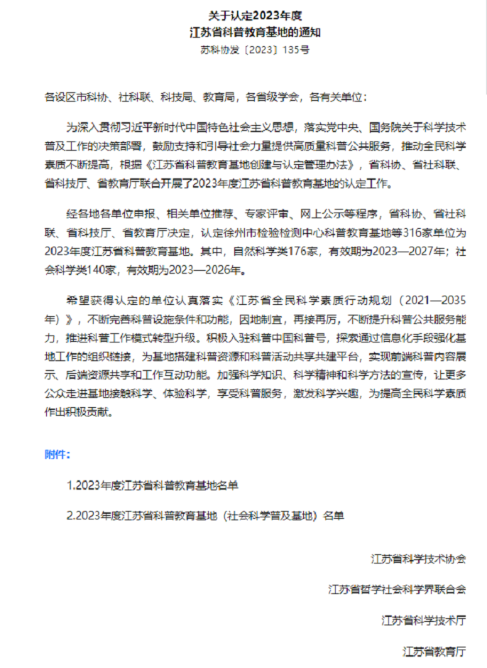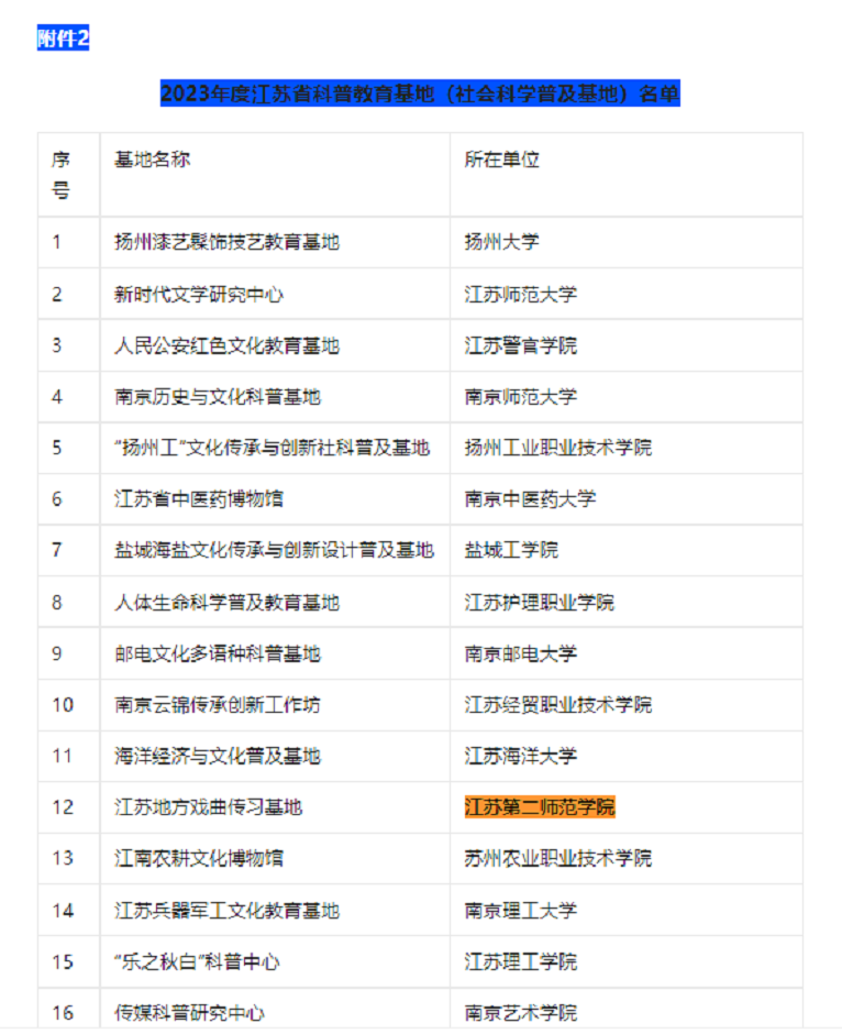 近日,江苏省科学技术协会、江苏省哲学社会科学界联合会、江苏省科学技术厅、江苏省教育厅联合发布《关于认定2023年度江苏省科普教育基地的通知》,我校“江苏地方戏曲传习基地”成功入选。