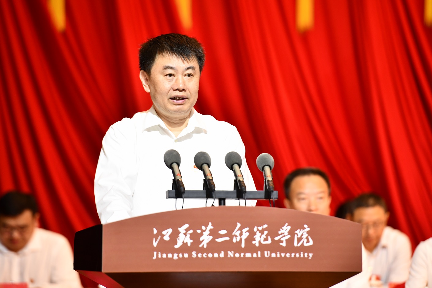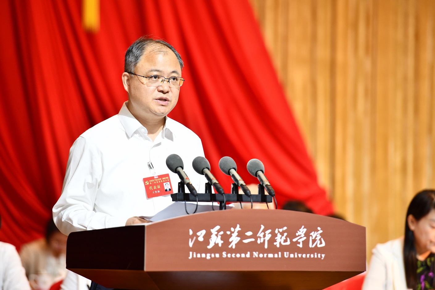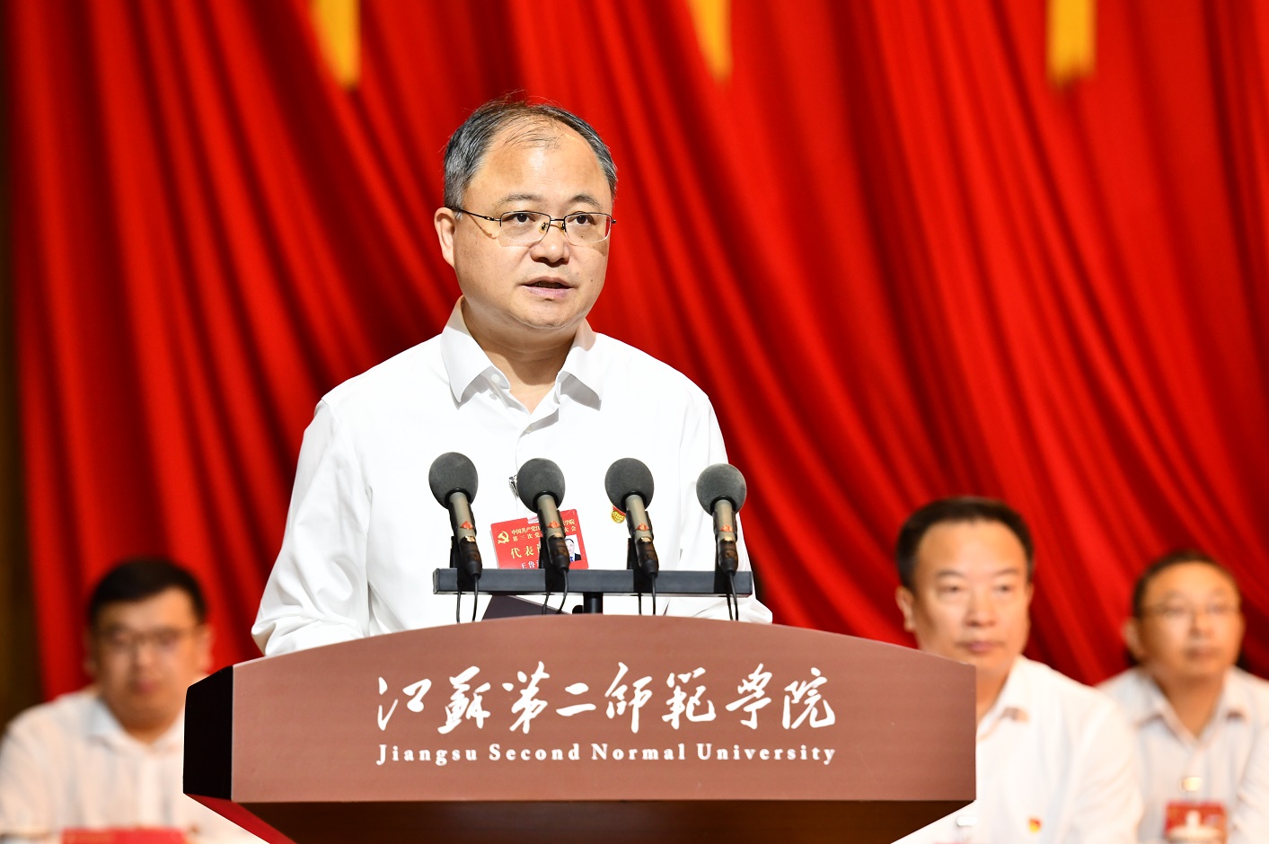 在热烈的掌声中,王鲁沛同志受中国共产党江苏第二师范学院第二届委员会委托,作题为《弘扬践行教育家精神 勇担教师教育使命 奋力开启特色鲜明高水平大学建设新征程》的工作报告。