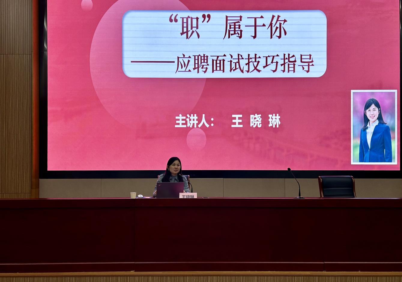 为帮助我校毕业生更好地提升面试能力,提高毕业生面试成功率,11月10日下午,招就处邀请到高级教师、南师附中江宁分校初中部副校长、南京市第十届学科带头人、南京市第九届优秀青年教师、南京市巾帼标兵王晓琳来我校开展了题为“职属于你——应聘面试技巧指导”讲座。讲座由招就处就创业指导中心主任蔡雨婷主持,全校共有200余名学生参加。