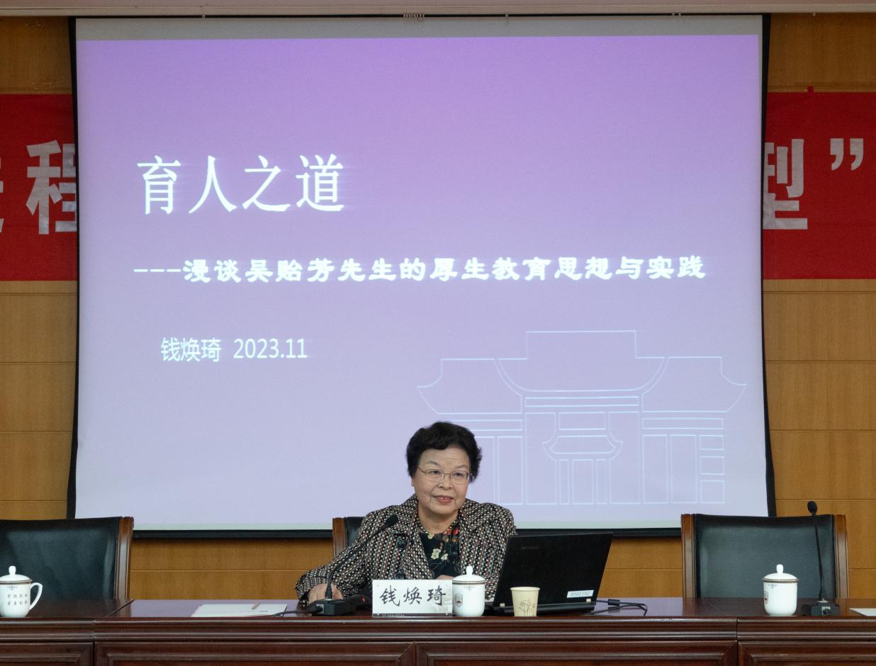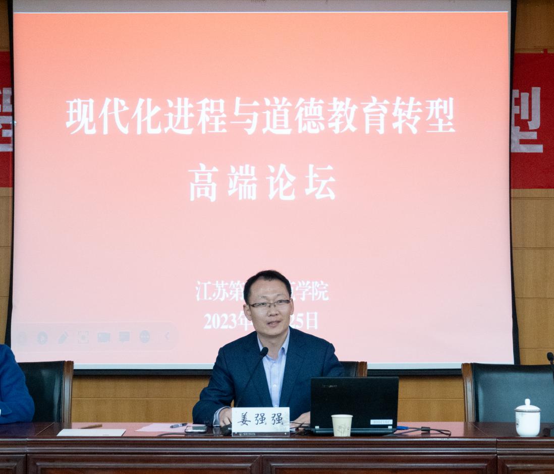 专家报告阶段,南京师范大学金陵女子学院吴贻芳研究中心主任钱焕琦教授做了题为《教育家精神在江苏——吴贻芳教育思想研究》的报告。她结合吴贻芳特殊的人生经历、求学历程以及其以“厚生”校训引领,把近代一所女子大学办成至今在世界具有重要影响、为诸多领域输送高尖人才的教育实践,生动阐释“厚生”教育思想的内涵和办学之道。浙江省习近平新时代毛中特思想研究中心文理学院基地研究员高健就“中国式现代化与公民道德建设”相关问题做了分享。苏州大学教育学院万东升教授做了“科技时代道德教育问题研究”的主题报告。淮阴师范学院马院院长兼宿迁学院马院院长(省委组织部委派)姜强强就“传统文化中的师道”学术问题进行了交流。