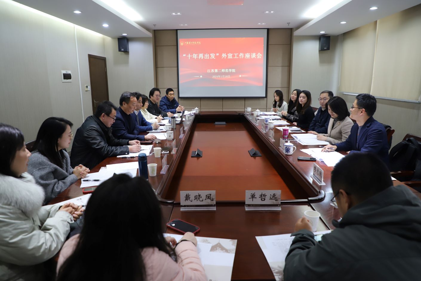 1月18日下午,我校在草场门校区召开“十年再出发”外宣工作专家咨询会。党委常委、副校长皇甫立同,党委常委、副校长梅景辉,人民日报社江苏分社社长何聪,光明日报社驻江苏记者站站长苏雁,中国青年报驻江苏记者站站长李超、主任夏韵,中国社会科学报驻江苏记者站副站长王广禄,新华日报全媒体科教新闻部主任助理杨频萍,中国教育报驻江苏记者站记者、江苏教育报刊总社全媒体新闻中心主任缪志聪,江苏教育报刊总社《江苏教育报》主编李大林,中国教育电视台驻江苏记者站记者、江苏教育报刊总社全媒体新闻中心记者陈思洋等媒体专家应邀出席,我校相关职能部门负责人和宣传部全体同志参加会议。会议由党委常委、宣传部部长李安林主持。