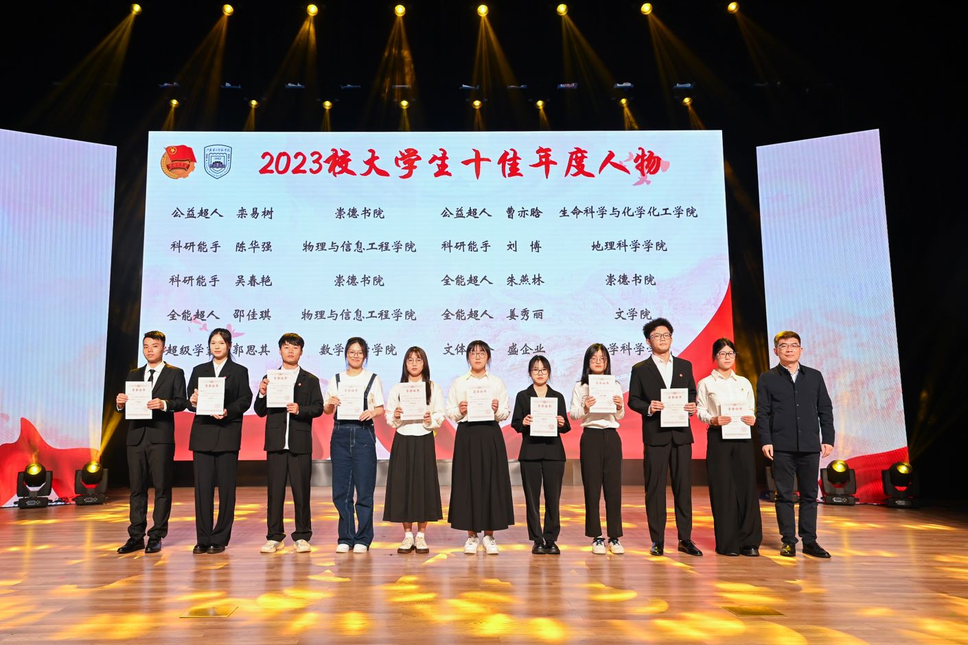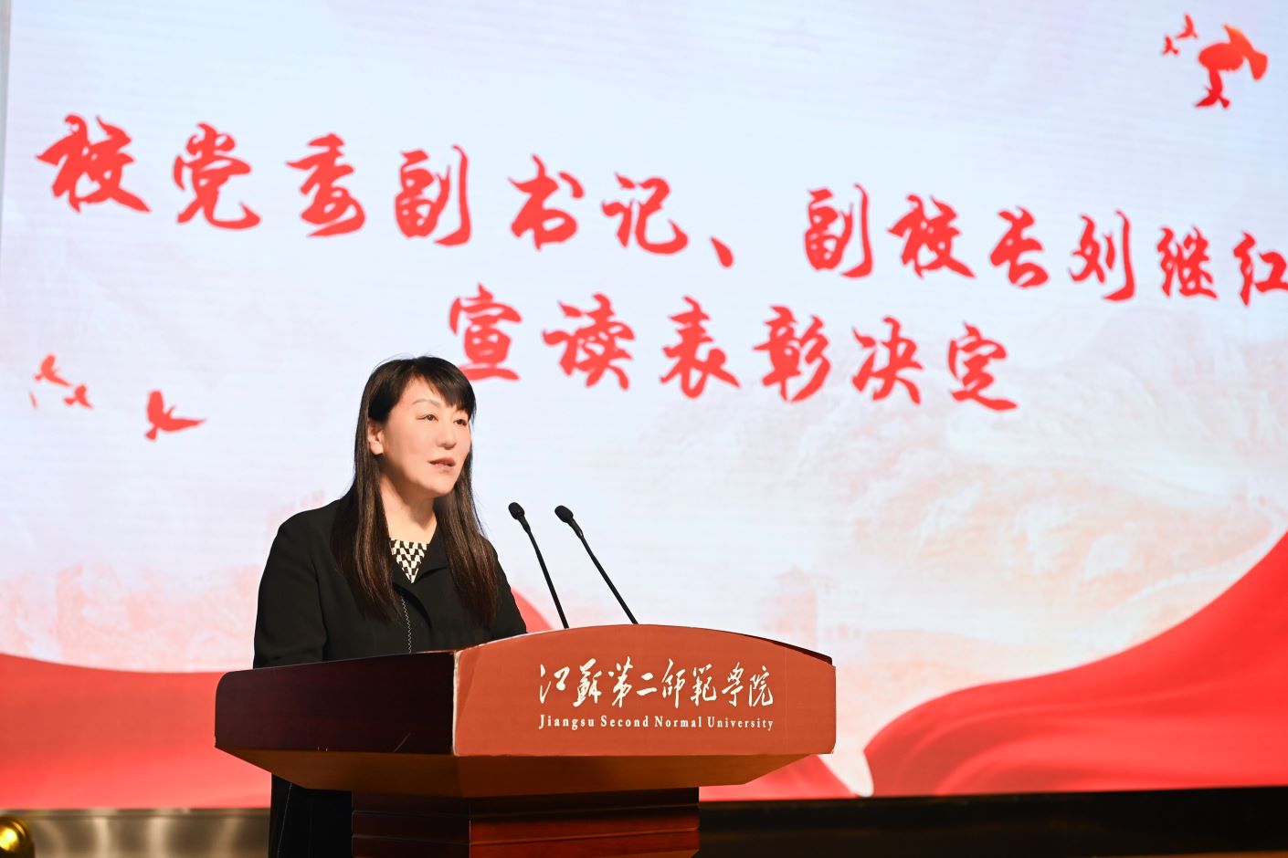 刘继红宣读《关于表彰2023—2024学年共青团优秀个人和先进集体的决定》,与会领导分别为学校2023年度共青团优秀个人和先进集体、大学生十佳年度人物、江苏省青年志愿者行动先进典型进行颁奖。