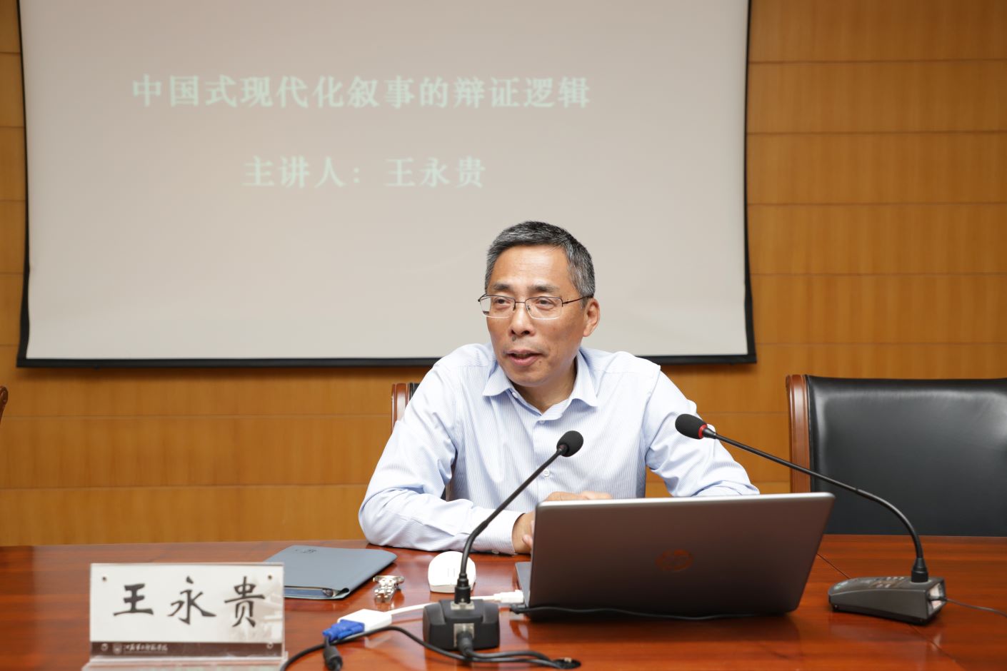 讲座第二部分由王永贵教授以“中国式现代化叙事的辩证逻辑”为主题,探讨中国式现代化的独特内涵、鲜明特点和叙事方式。主要从五个角度理解中国式现代化:第一,历史承接性,即如何用科学世界方法来认识历史、认识经典著作以及认识中国式现代化。第二,内在特质,即如何在传承中华优秀传统文化基因的同时用马克思主义思想方法激活中华传统文化的创造性转化和创新性发展。第三,注重整体性,即如何加强顶层设计,整体推进,系统协调,构建中国式现代化的视野和方法。第四,注重批判视野,即从辩证视角研究现代化。第五,区域特色,即如何走自己的路来形成体现中华优秀传统文化的特征。