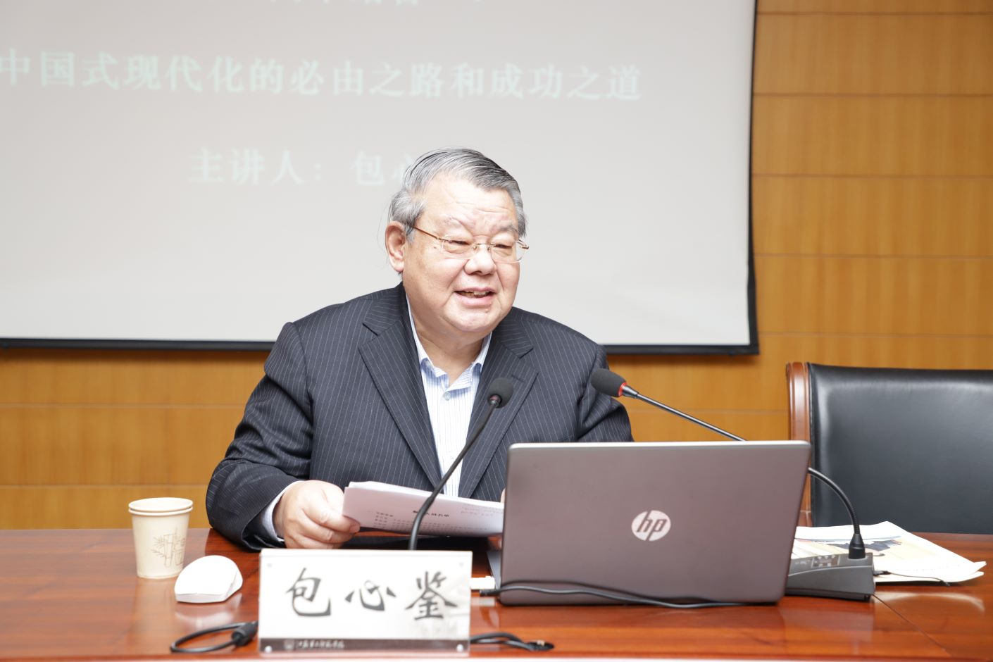讲座第一部分由包心鉴教授以“坚持‘两个结合’中国式现代化的必由之路和成功之道”为主题,从四个方面展开探讨:第一,如何正确把握“两个结合”的重大意义及相互关系?包心鉴教授强调“两个结合”是党历史经验的深刻总结,是探索中国特色社会主义道路的规律性认识,是发展中国特色社会主义的必由之路,是中国共产党取得成功的最大法宝。第二,“两个结合”的实质是对中国式现代化道路的不懈探索和正确选择。通过回顾中华民族近代以来的历史,指明探索中国式现代化道路的逻辑起点,强调中国共产党的百年历史就是探索中国式现代化道路的历史,习近平“两个结合”的重要思想是在领导中国式现代化探索过程当中进一步深化了对“两个结合”的认识。第三,中国式现代化过程中如何坚持第一个结合?重要任务是坚定现代化的人民性方向,构建中国式现代化的人民主体性。第四,中国式现代化过程中如何理解第二个结合?首先要巩固中国式现代化的文明根脉。中华优秀传统文化的博大精华主要体现在六个方面:一是人文至上精神,二是立德修身品质,三是家国一体情怀,四是维新变革思想,五是中和为美境界,六是崇尚整体思维。此外,包心鉴教授还强调在理解“两个结合”的关系,创造中华民族现代文明的过程中要澄清三大模糊认识,一是不能简单将传统文化与马克思主义等同起来,二是不能通过抬高传统文化贬低马克思主义的根本指导作用,三是不能以第二个结合取代第一个结合。