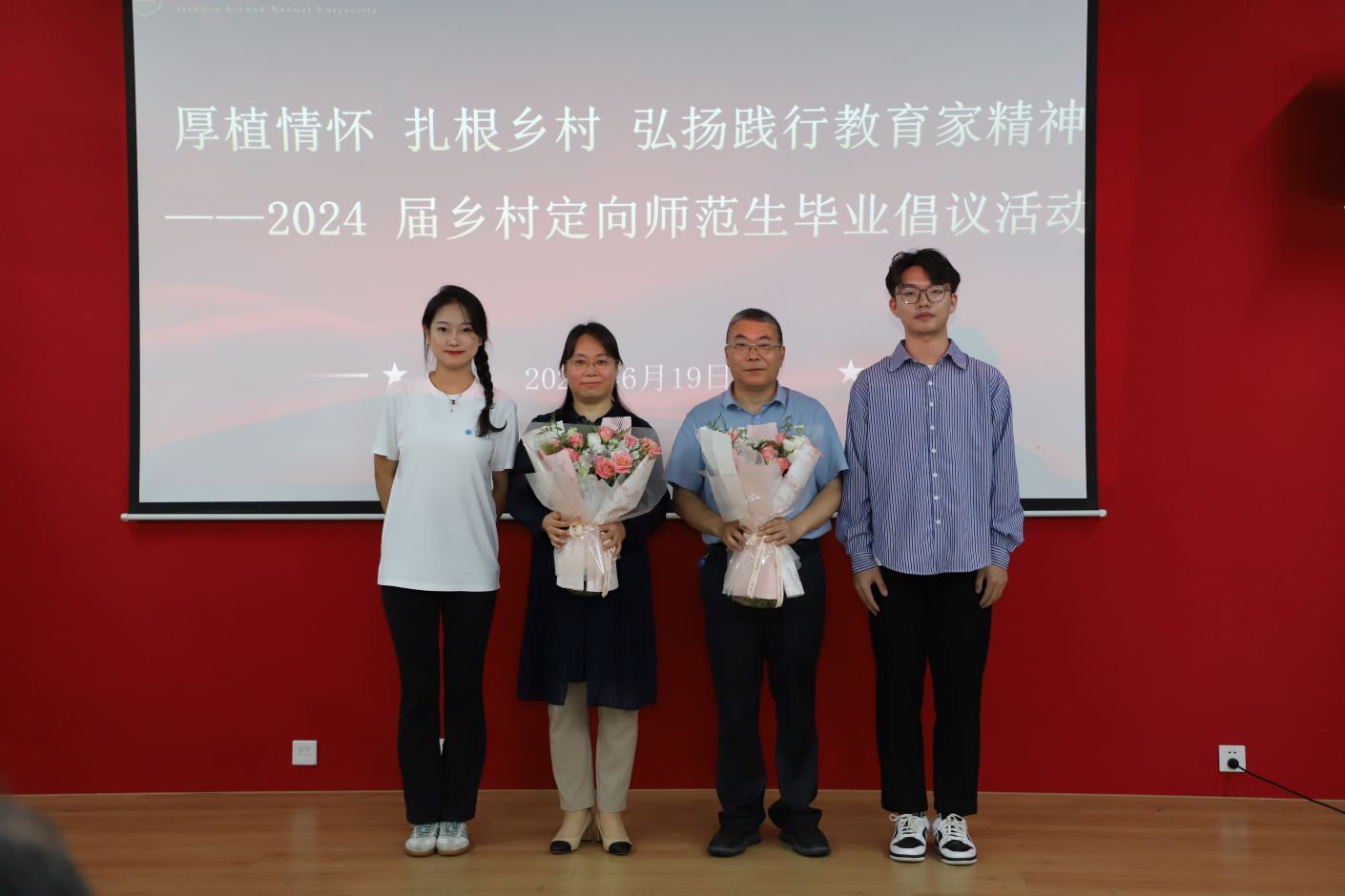 校领导王鲁沛、刘继红为毕业生代表赠送礼物,勉励他们大力弘扬践行教育家精神,扎根乡土,将方寸之愿望融入宏伟理想,把“小我”融入祖国“大我”,为乡村教育事业贡献青春力量,让青春与祖国的发展同频共振。