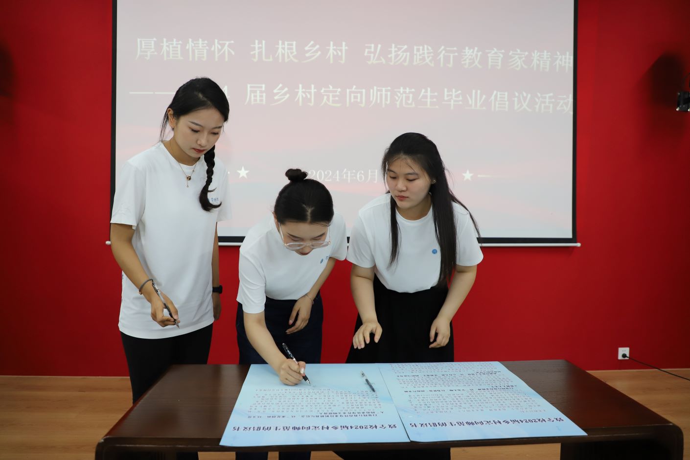 活动现场,学弟学妹向毕业生送上祝福,毕业生代表向教师代表献花。“自觉践行教育家精神,以‘学为人师,行为世范’的标尺争做立德树人大先生;积极厚植乡土情怀,以‘心有大我,乐教爱生’的担当成为乡村教育的守望者;终身秉持躬耕教坛信念,以‘求是创新,以文化人’的追求化身传承文明摆渡人。”毕业生代表宣读倡议书,并在倡议书上签下名字。