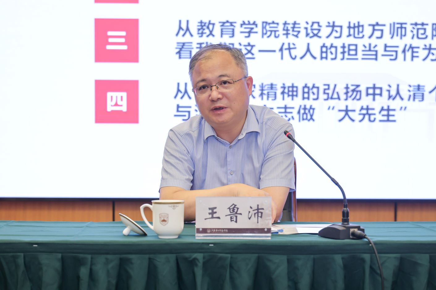 王鲁沛在授课中系统梳理了新中国师范教育的发展历程,回顾了我校发展所处的历史方位和优良传统。他指出,七十余年来,我校始终忠诚于党的教育事业,与国家和时代同频共振,教育报国之心矢志不渝。在新时代背景下,要全面把握世界百年未有之大变局和中华民族伟大复兴战略全局,培养德智体美劳全面发展的社会主义建设者和接班人,打造实现中华民族伟大复兴的“梦之队”。